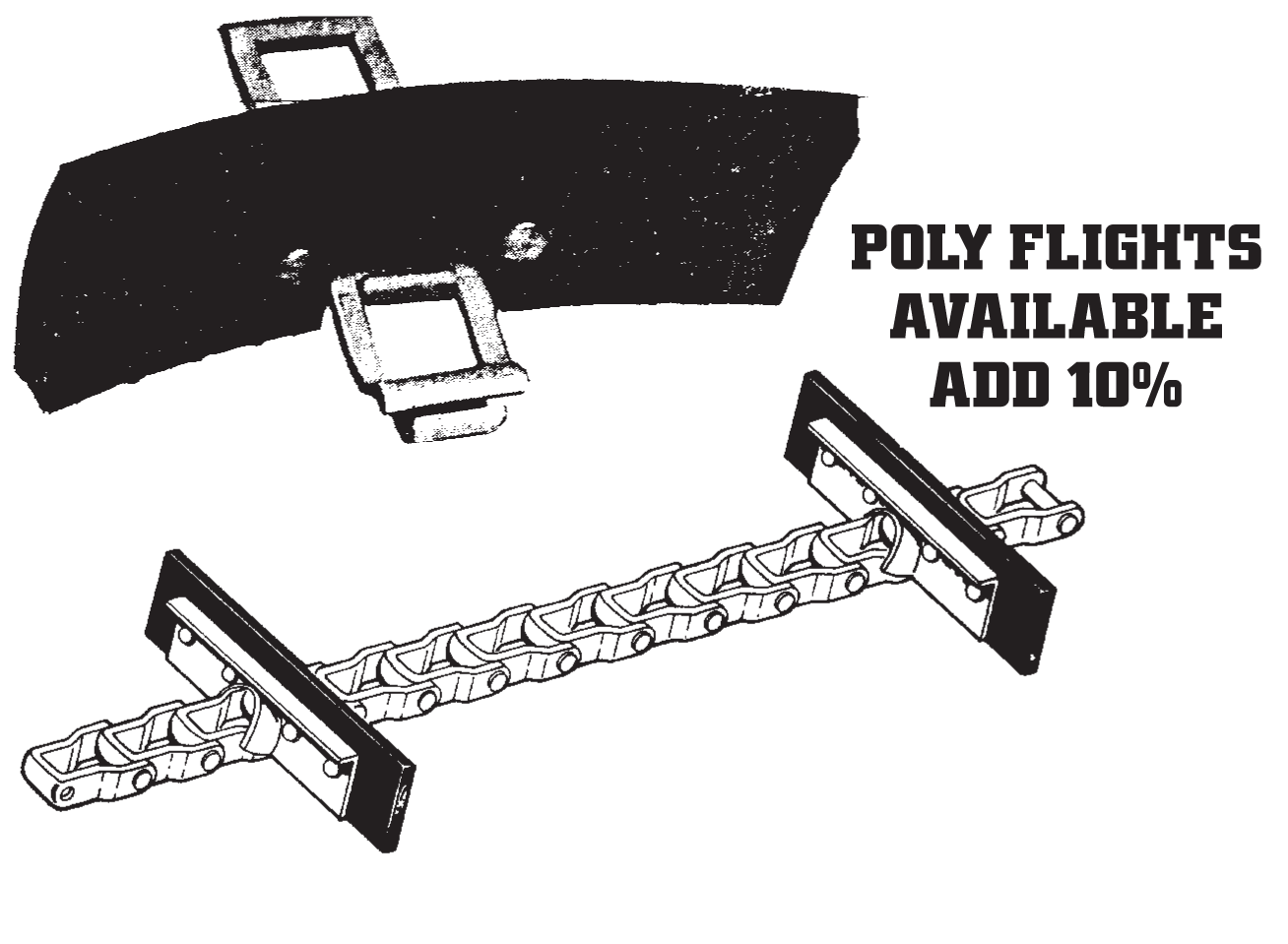 Detachable chain uses quality American made chain, back plates, and rubber flights with 1/2" thick rubber flights with 2 rivets, 14" spacing